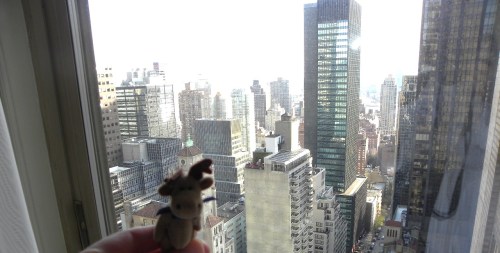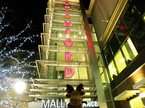 Like any good vacationer, Milton began the trip with some shopping at Stamford Town Center in Connecticut. A moose has got to look good, you know.